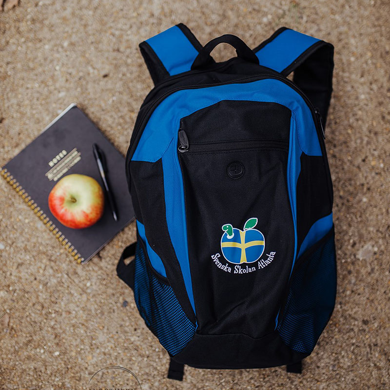 3. Black Backpack for books with small Swedish School of Atlanta logo on the top.