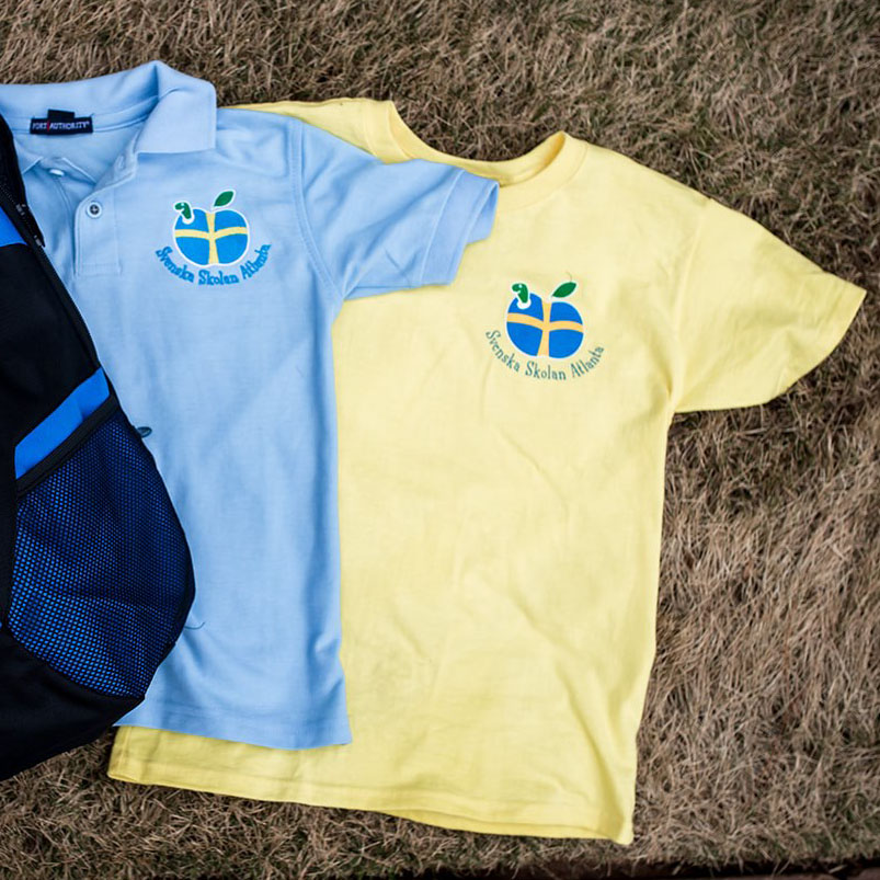 1. Light blue Polo T-shirt with a small Swedish School of Atlanta logo on. We have the following sizes for juniors and adults (unisex):